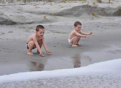 We arrived before the house was ready so parked at the house anyway and walked back to the beack (the house is RIGHT on the beach). We weren't sure how the boys would like the beach, well they LOVE it!!! The smiles are their little faces were just amazing, a look we won't soon forget. They dove right in, fell in the wave and got stripped down to underwear and diaper boy!! The love the water, the sand, the shells.....